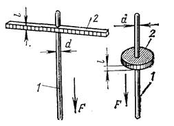 Рис. 17. Образцы для определения сдвиговой адгезионной прочности в соединениях полимеров с волокнами: 1 - волокно диаметром d; 2 - слой полимер толщиной l Адгезионное соединение возникает на поверхности волокна, погруженного в слой адгезива. Геометрия соединения характеризуется длиной l, определяемой толщиной слоя полимера, и площадью S = p dl, где d - диаметр волокна. (Величину S можно называть также площадью контакта). При разрушении образцов измеряют силу F, необходимую для выдергивания волокна из слоя адгезива, т. е. определяют сдвиговую адгезионную прочность. Адгезионную прочность каждого испытанного образца рассчитывают по формуле