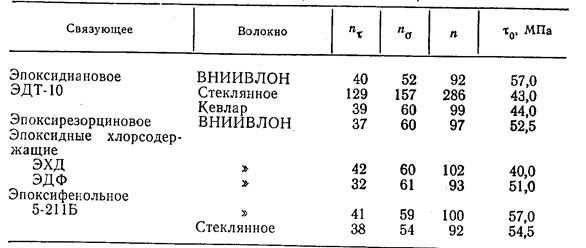 При производстве углепластиков широко используются различные эпоксидные матрицы, а также связующие с повышенной теплостойкостью. Ниже приведены данные об адгезионной прочности (t0, МПа) при взаимодействии термореактивных связующих с углеродными волокнами Модмор-2 и (для сравнения) с бесщелочными стеклянными диаметром 9 мкм (S = 6×10-3 мм2):