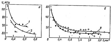 Адгезионная прочность в этом случае существенно ниже, чем при взаимодействии со стеклянными волокнами. Например, для связующего ЭДТ-10 значение tо при взаимодействии со стеклянными волокнами (при одной и той же геометрии соединения) равно 55 МПа. Активирование поверхности волокон окислительной электрохимической обработкой приводит к существенному повышению прочности на границе раздела. Это, прежде всего, проявляется в том, что при сохранении геометрии соединения резко возрастает число образцов, разрушающихся по волокну. Поэтому требуется значительно уменьшить среднюю площадь; успешно определить значение tо удается лишь при Scp=(1,5-2)×10-3 мм2. Влияние обработки поверхности на адгезионную прочность (S = 2×10-3 мм2) иллюстрируют следующие данные: