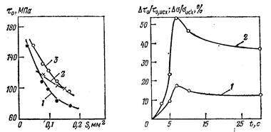 РИС. 19. Зависимость адгезионной прочности системы борные волокна диаметром 100 мкм—эпоксидное связующее (1—ЭДТ-10, 2—УП-2130, 3— ДГЭР) от площади соединения РИС. 24. Зависимость адгезионной прочности системы борное волокно диаметром 100 мкм — эпоксиполиизоцианатное связующее (1) и прочности боропластика при изгибе (2) от времени травления волокон в азотной кислоте Ниже приведены значения прочности сцепления (S=0,15мм2) с поверхностью борных волокон (d=100 мкм) эпоксидиановых и эпоксирезорциновых связующих (см. также рис. 19):