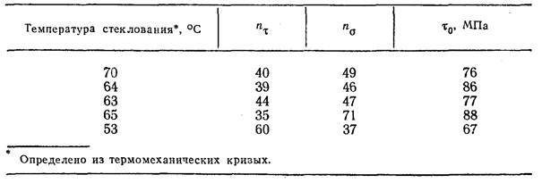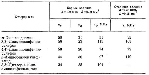 Значения t0 для диановых и резорциновых эпоксидных смол различаются мало (так же, как для соединений с углеродными, стеклянными и стальными волокнами). Адгезионная прочность эпоксирезорцинового связующего на основе смолы УП-637 заметно меняется при замене отвердителя (табл. 5), причем весьма высокие значения t0 получаются при отверждении эпоксирезорциновых олигомеров аминосульфонами. Из таблицы следует также, что характер изменения адгезионной прочности при замене отвердителя не зависит от природы наполнителя (борное волокно, стальная проволока)[7]. Таблица 5 Влияние природы отвердителя на прочность сцепления эпоксирезорцинового связующего на основе УП-637 с борными и стальными волокнами [7]