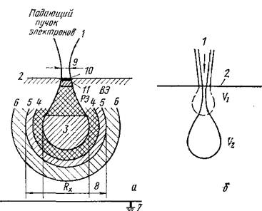 Рис. 20. Области возбуждения в объекте разных процессов взаимодействия электронов с веществом (металл), используемых в электронно-оптических приборах для анализа состава или микроструктуры (а), и те же области, но при разной энергии электронов зонда (б): 1—падающий пучок электронов; 2 — поверхность объекта (мишень); 3—первичное возбуждение рентгеновских лучей; 4 — граница возбуждения рентгеновских лучей торможения; 5—область возбуждения вторичного (флюоресцентного) рентгеновского излучения; 6 — область рассеяния рентгеновских лучей и дифракция Косселя; 7—ток образца; 8 — возможное разрешение для рентгеновского микроанализатора (Rх); 9—диаметр зонда; 10 — область, от которой регистрируются ОЖЕ- электроны: 11 — ВЭ и РЭ- области, от которых регистрируются вторичные и упруго рассеянные электроны V1; V2 — области возбуждения при разном ускоряющем напряжении; V1> V2 [8] Наиболее универсальное значение имеют регистрация вторичных электронов и регистрация отраженных (или «рассеянных обратно») электронов. Те и другие электроны улавливаются коллектором, установленным возле образца, преобразуются в электрический сигнал, который усиливается и затем направляется к электронно-лучевой трубке, где он модулирует яркость электронного луча, строящего изображения на экране этой трубки. 5.2. Устройство и работа растрового электронного микроскопа Растровый электронный микроскоп (РЭМ), как и традиционный микроскоп, имеет линзовую систему, но функция этой системы состоит в том, чтобы получить пучок электронов предельно малого сечения (зонд), обеспечивающий достаточно большую интенсивность ответного сигнала от участка объекта, на который попадает этот пучок. Электронный пучок формируется в электронной пушке (рис.21). Между катодом и анодом создаётся высокое напряжение (100-200 кВ) и электроны начинают вырываться с разогретой поверхности катода. Под действием высокого напряжения электроны разгоняются и проходят через анодную сетку. Далее пучок электронов проходит через систему электронных линз. Электронные линзы представляют собой индукционные катушки которые фокусируют и отклоняют поток электронов (зонд).