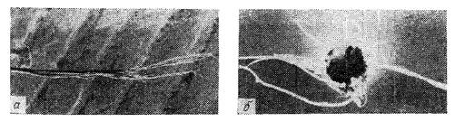 Рис. 21. Разрушение адгезионных соединений эпоксидное связующее — высокопрочное органическое волокно ВНИИВЛОН: а — конец волокна, выдернутого из соединения; б — отверстие в смоле после выдергивания волокна