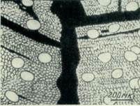 Чтобы получить информацию о микроструктуре достаточно большой области, которая представляла бы характерную структуру объекта, ответственную за интересующие нас макроскопические физические или механические свойства, зонд заставляют обегать (сканировать) заданную площадь объекта по заданной программе (движется луч по строчкам, образующим квадрат, круг и т. д.)[8]. Масштаб изображения на экране катодно-лучевой трубки определяется отношением размера сканирования на поверхности объекта и размера изображения (растра) на экране. Уменьшение размера участка сканирования приводит к росту увеличения изображения. Предельные увеличения в современных конструкциях РЭМ достигают 150000—200000. Разрешающая способность зависит от вида используемого сигнала и вида объекта. Наименьшие значения разрешаемого расстояния 70—100 Å при использовании эффекта эмиссии вторичных электронов. При любом виде используемого для выявления микроструктуры сигнала характерным является чрезвычайно большая глубина резкости вследствие очень малой апертуры (практически, параллельности) электронного зонда. Глубина резкого изображения объекта оказываем всегда не меньшей, чем размер изображаемого участка в плоскости. Если линейный размер экрана около 100 мм, то при увеличении 10000 изображаемое поле объекта »10 мкм, примерно такой же будет и глубина резкого изображения объекта (»1 мкм)[1]. Устройство электронно-оптической части и камеры объекта РЭМ типа «Стереоскан» показаны на рис. 23 б. 5.3. Применение растровой электронной микроскопии в исследованиях адгезионных соединений Растровая электронная микроскопия нашла применение при исследовании адгезионных соединений. С помощью РЭМ изучают характер разрушения адгезионных систем (адгезионный, когезионный или смешанный), поверхности субстратов, швы клеевых соединений, прорастание трещин в материалах. Вся эта информация необходима при анализе адгезионных соединений. Ниже приведены электронно-микроскопические снимки, полученные растровым электронным микроскопом: