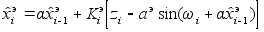 Комментарии к (6) и (7) : Справа - невязки, взяты из тео- рии нелинейной фильтрации. Од- нако в (6) экстраполированное значение получается из фор- мулы (7). (7) - это кусок ряда Тейлора. В нелинейной фильтрации экстраполяция получается ав- томатически. А здесь мы ее искусственно создали в формуле (7) , но она очень сильно близка к формуле (5). | Фильтрация | Первое слагаемое в (6) (верхняя строка) есть координаты