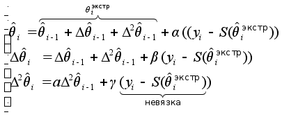 Экстраполяция.a,b,g - фильтры Реализация нелинейного фильтра по формуле (5) несмотря на ее реккурентный характер достаточно сложна для реализации на сигнальных процессорах, поэтому часто используют еще одно упрощение - переходят от векторно-матричной записи нелинейной фильтрации по формуле (5) к скалярной записи. (заметим, что формула (5) реализует следящий измеритель некоторого параметра) a,b,g - фильтры значительно упрощают синтез следящих измерителей. Идея состоит в том, что вместо матричного коэффициента