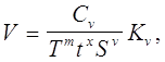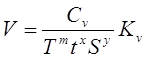 где Сv - коэффициент, учитывающий условия обработки; m, x, y - показатели степени; T - период стойкости инструмента; t - глубина резания, мм; S - подача, мм/об; Kv - обобщенный поправочный коэффициент, учитывающий изменения условий обработки по отношению к табличным