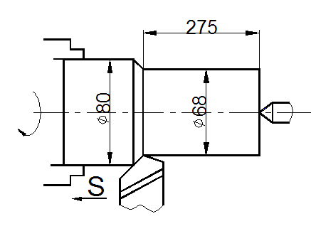 3.2 Назначаем подачу. Для державки резца сечением 25х25 мм, диаметра обработки до 100 мм и глубины резания до 8 мм рекомендуется подача S=0,5...0,7 мм/об; Проверим допустимость рекомендуемой подачи по мощности электродвигателя , прочности державки резца и прочности пластинки твердого сплава. Для глубины резания t=6 мм, мощности электродвигателя Nд=8 кВт и для резца j1>0° допускается подача S=0,7мм/об. Для стали с пределом прочности sв=550 МПа (55 кг/мм2) поправочный коэффициент Кмs=1,07. Следовательно, подача, допускаемая мощностью электродвигателя (из условий обеспечения работы для твердого сплава со скоростью не ниже 50 м/мин) S=0,7×1,07=0,75 мм/об. Для резца с державкой сечением 25х25 мм и глубиной резания t=6 мм находим подачу S=3 мм/об. Умножив эту подачу на поправочный коэффициент Кмs=1,07, соответствующий стали с пределом прочности sв=550 МПа (55 кг/мм2), и Кмs=0,58, соответствующий вылету резца l=1,5 H, найдем подачу, допустимую прочностью державки резца: S=3×1,07×0,58=1,86 мм/об. Для резца с главным углом в плане j=45°, толщиной пластинки твердого сплава с=4 мм и для глубины резания t=6 мм находим подачу S=1,11 мм/об. С учетом поправочного коэффициента для стали (sв=550 МПа), Кмs=1,07, допускается подача по прочности пластинки твердого сплава S=1,11×1,07=1,19 мм/об. Из сопоставления подач S=0,7 мм/об, S=1,86 мм/об и S=1,19 мм/об, видим, что величину подачи лимитирует мощность электродвигателя. Подача, допустимая мощностью электродвигателя, не ограничивает максимальную подачу S=0,7 мм/об. Такая подача имеется на станке (согласно паспортным данным), следовательно, ее и примем для выполнения технологического перехода обработки Æ68 . 3.3. Скорость резания и частота вращения шпинделя. Для глубины резания t=6 мм резца проходного прямого с главным углом в плане j=45° для S=0,7 мм/об соответствует V=100 м/мин, Pz=6630 H, Nэ=10,7 кВт.
