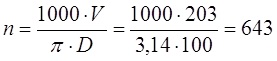 учетом поправочных коэффициентов Kmv=1; Knv=1; при V=V× Kmv× Knv× КБV× Kj=203×1=203 м/мин. Частота вращения шпинделя, соответствующая найденной скорости резания