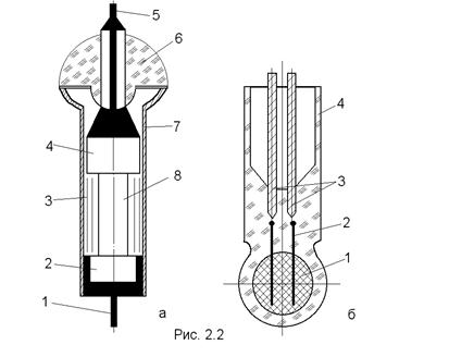 Металлические термометры сопротивления получившие наибольшее распространение, имеют чувствительный элемент в виде тонкой (диаметром 0,05 мм) проволоки 2, намотанной на слюдяную пластину 1 (или пластмассовый цилиндр) и помещенный в защитный чехол 3 (рис. 2.1). проволоку изготовляют в основном из чистых платины или меди. В соответствии с этим различают термометры сопротивления платиновые (ТСП) и термометры сопротивления медные (ТСМ). У чистых металлов сопротивление больше, чем у сплавов, поэтому для изготовления термометров сопротивления используют чистые металлы. Для металлических термометров сопротивления ТСП и ТСМ стандартных градуировок стандартизованы градуировочные таблицы, пользуясь которыми можно определить по измеренному значению сопротивления термометра температуру окружающей его среды и, наоборот, определить сопротивление термометра для различных значений температуры. Металлические термометры сопротивления имеют следующие достоинства: высокую точность измерения, возможность использования в комплекте с ним измерительных приборов со стандартными шкалами, взаимозаменяемость, возможность централизации контроля температуры путем присоединения нескольких взаимозаменяемых термометров сопротивления через переключатель к одному измерительному прибору, возможность использования их с информационно вычислительными системами. Для изготовления чувствительных элементов полупроводниковых термометров сопротивления (терморезисторов) применяют смеси различных полупроводниковых веществ: окислов меди и марганца, окислов кобальта и марганца, двуокиси титана и окисла магния и т.д. для измерения низких температур используется германиевый термометр сопротивления. Чувствительный элемент терморезисторов изготовляют различной формы. Наиболее распространены формы в виде небольшого цилиндра, стержня, шайбы и бусинки. Для предохранения от возможных механических повреждений и вредного воздействия среды, температура которой измеряется, чувствительный элемент покрывают эмалью, помещают в защитный чехол. На рис. 2.2 а представлен полупроводниковый терморезистор, чувствительный элемент которого выполнен в виде небольшого цилиндрического стержня 8, покрытого эмалевой краской и металлической фольгой 3, с контактными колпачками 2, 4 и выводами 1, 5. снаружи терморезистор защищен чехлом 7, в верхней части которого имеется стеклянный изолятор 6.