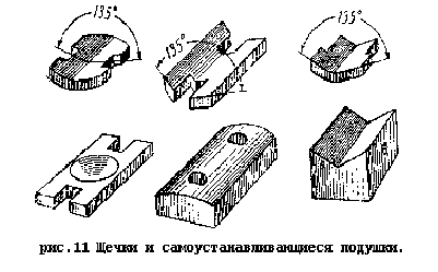 В этом случае, когда призмы мягче чем подушки или щечки то при работе вершины их постепенно закругляются и, хотя чувствительность весов в этом случае также снижается, но в значительно меньшей степени. Детали, называемые щечками (рис.11), предохраняют подушку от выпадения и удерживают призму от сдвига с подушек. В весах с предельной нагрузкой до 3 т – из малоуглеродистой стали, но стальным закаленным вкладышем в месте соприкосновения с острием призмы.