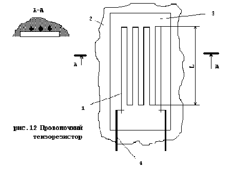 Относительное изменение сопротивления тензорезистора определяется формулой: D R / R = D l / l (1 + 2m) + D r / r (15) где R- сопротивление тензорезистора, Ом ; l - длина проволоки, м ; r- удельное сопротивление материала проволоки, Ом*м ; m- коэффициент Пуассона для материала проволоки. Основными характеристиками тензорезистора являются его активное сопротивление RД , его база L (см. рис.12) и коэффициент тензочувствительности К, в соответствии с формулой (7) равный: К = (D R / R) / (D l / l) = (1 + 2m) + (D r / r) / (D l / l) (16) Для приготовления проволочных решеток используются материалы, имеющие высокое значение коэффициента тензочувствительности и малое значение температурного коэффициента сопротивления. Наиболее часто в качестве материала для проволочных тензорезисторов используется константан, элинвар, карм и изоэластик. Наибольшее распространение в отечественной тензоизмерительной технике получили тензорезисторы из специальной константановой тензометрической проволоки диаметром 0,025 – 0,035 мм, разработанной Научно - исследовательским конструкторским институтом испытательных машин, приборов и средств измерения масс (НИКИМП), институтом “Гипроцветметобработка” и подольским заводом “Микропровод” . За последние годы значительных успехов достигла техника получения различных полупроводниковых материалов, широко используемых в радиотехнической промышленности, что открыло широкие перспективы в решении проблемы разработки и изготовления полупроводниковых тензорезисторов. Полупроводниковые тензорезисторы, сохраняя ряд преимуществ, присущих проволочным фольгированным тензорезисторам (ничтожная масса, малые размеры), имеют значительно большую тензочувствительность и высокий уровень выходного сигнала измерительных схем (в ряде случаев это позволяет упростить либо упразднить усилительную аппаратуру). Важнейшей особенностью полупроводниковых тензорезисторов является возможность изменения в широких пределах их механических и электрических свойств, что принципиально неосуществимо в проволочных и фольгированных тензорезисторах. Например, при одних и тех же геометрических размерах сопротивление полупроводникового тензорезистора может лежать в пределах от десятков ом до десятков кОм, а коэффициент тензочувствительности – от 100 до + 200 и выше. Полупроводниковым тензорезисторам, технологии их изготовления, опыту эксплуатации, конструированию на их базе различного типа преобразователей, перспективам их использования и другим вопросам посвящена обширная периодичная и патентная литература. Наибольшее распространение у нас в стране и за рубежом получили кремниевые и германиевые тензорезисторы p- и n- типов. В Новосибирском электротехническом институте (НЭТИ) под руководство проф. А.Ф. Городецкого были разработаны кремниевые тензорезисторы типа “нэтистор” из кремния p- и n- типов с выводами из золота. На базе этих разработок освоены первые промышленные образцы полупроводниковых тензорезисторов. В настоящее время тензорезисторы применяются не только для измерения линейных деформаций (напряжений), но и других величин: сил, ускорений, давлений, вибраций и др. В этом случае тензорезистор выполняет лишь роль первичного (чувствительного) элемента, а сами преобразователи физических или механических величин, как правило, дополняются упругими элемент