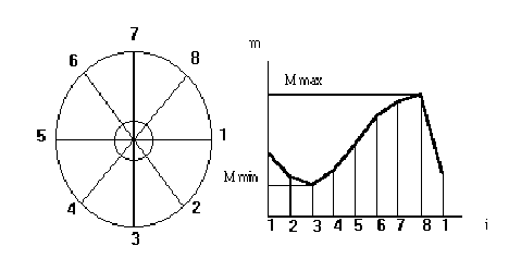 рис. 3.2 Определение скрытой неуравновешенности ротора m — масса пробного груза, i — обозначение положения ротора; а — разбивка ротора на сектора, б — диаграмма разбалансировки ротора. нумерации линий может быть произвольным: по часовой стрелке или против. Ротор с прикрепленным к нему уравновешивающим грузом поварачивают таким образом, чтобы линия под номером 1 оказалась в горизонтальной плоскости. К боковой поверхности ротора напротив линии 1 прикрепляют пробный груз такой величины, масса которого достаточна (без избытка) для выводфа ротора из состояния равновесия. Величину пробного груза, приводящего к разбалансироки ротора, определяют опытным путем, посредством прикрепления к ротору мелких порций пластилина ло тех пор, пока он не придет в движение. Затем груз снимают и взвешивают на весах с точностью до десятых долей грамма. Аналогичные операции поочередно выполняют для всех других положений ротора, обозначенных номерами. Пол данным о величине пробных грузов, вызывающих дисбаланс ротора в его различных положениях, строят диаграмму (см. рис. 3.2). По диаграмме определяют максимальную (mmax) и минимальную (mmin) массу пробного груза, необходимого для вывода ротора из равновесия. Там, где распологается груз наибольшей величины, находится легкая сторона ротора, а в том месте, где устанавливается груз наименьшей величины, находится тяжелая сторона ротора. Следует подчеркнуть, что грузы mmax и mmin должны находиться в диаметрально противоположных точках. Для устранения скрытой неуравновешенности ротора на его легкрй стороне прикрепляют корректирующий груз, масса которого определяется по формуле: mk = 0,5 (mmax - mmin) (31) Момент сопротивления (трения), обусловленный силами, припятствующими возникновению момента на датчике, составляет: Mтр.= mk g Rk (32) где Rk — расстояние от центра массыкорректирующего груза до оси вращения ротора. Суммарная сила сопротивления (трения), действующая в месте контакта призмы с подушкой опоры, составляет: Fтр. = Mтр. /r = 2mk g Rk / d (33) Отношение силы сопротивления к весу ротора характеризует чувствительность устройства и определяет качество балансировки ротора: