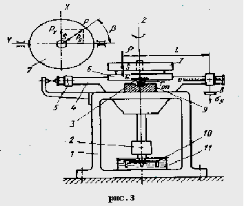 рис.1 На стендах типа СБС-1 и СБС-4 при изменении неуравновешенности ротора обычно используют метод “обхода грузом” или метод “пробных грузов”, что не дает высокой производительности, а поэтому их применять в массовом производстве нецелесообразно. Измерение величины и угловой координаты неуравновешенности на балансировочных станках типа СБС-2 и СБС-3 выполняется более совершенным способом. В частности, на стендах типа СБС-2 величина и угловая координата неуравновешенности ротора прочитываются непосредственно по соответствующим шкалам. На стендах типа СБС-3 измерение параметров неуравновешенности ротора можно выполнять методом “обхода грузом”, но обычно предпочитают более прогрессивный метод “двух замеров”. Метод сводится к измерениям неуравновешенности ротора в двух взаимно перпендикулярных положениях непосредственно на стенде, с последующим определением суммарной неуравновешенности с помощью специального приспособления. Эти стенды иногда комплектуются устройством для удаления неуравновешенности, что значительно повышает производительность статической балансировки. Оборудование второго вида, т.е. работающего в динамическом режиме, используется в промышленности сравнительно недавно и является новым. Станки такого вида обладают повышенной точностью и производительностью. Часто процесс измерения и устранения неуравновешенности выполняется в одном агрегате. Измерение величины и угловой координаты статической неуравновешенности на балансировочных станках, работающих в динамическом режиме, осуществляется электрическим методом, путем измерения величины и фазы электрического сигнала, отражающего колебания подвижной системы станка при движении неуравновешенного ротора. Иногда величины и фазы электрических сигналов характеризуют реакции в опорах ротора при его движении на балансировочном станке. Для получения электрических сигналов пользуются электродинамическими или пьезоэлектрическими датчиками того или иного типа. В редких случаях для определения параметров неуравновешенности пользуются методами механики, т.е. измеряют амплитуды колебаний подвижной системы станка в момент резонанса. К устройствам нашего вида относят стенды, называемые балансировочными весами типа СБС-3а и СБС-3б. Стенды типа СБС-3 работают в режиме статики, ось ротора при балансировке перемещается относительно неподвижной оси, поэтому они относятся к третьей группе первого вида балансировочных устройств для статического уравновновешивания. [1,т.2 с.511] Стенды типа СБС-3 получили в производстве довольно широкое распространение. В основном используются стенды типа СБС-3а, предназначенные для статической балансировки дискообразных роторов, имеющих посадочное базовое отверстие. Реже применяются стенды типа СБС-3б для роторов, имеющих собственные опорные шейки. В промышленности используются стенды типа СБС-3 различных конструкций, но в основе их лежит одна принципиальная схема - схема обычных неравноплечных рычажных весов, откуда и название стендов - балансировочные весы. Рассмотрим типовую конструкцию балансировочных весов с горизонтальной осью типа СБС-3б, приведенную на (рис.2) и предназначенную для уравновешивания дисковых роторов, имеющих собственные опорные шейки. Основными частями стенда являются опорная стойк