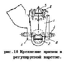 На рис.9 изображен узел крепления призмы конструкции “Эталон”. Регулируемая каретка 1 крепится на плече коромысла 2 при помощи двух штифтов 3 и винта 4. На верхней части каретки 1 в цилиндрической впадине находится седло 5 с хвостовиком, в который упираются установочные винты 6 и 7. Винтами 6 устанавливается требуемое положение призмы в горизонтальной плоскости, а при помощи винтов 7 регулируется длина плеча.