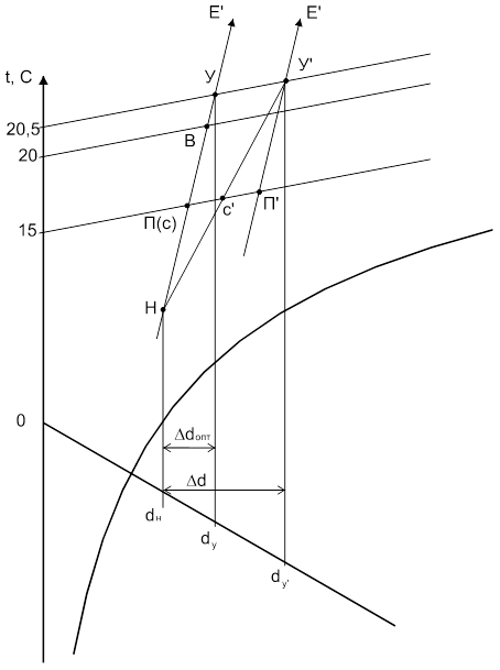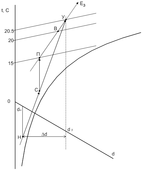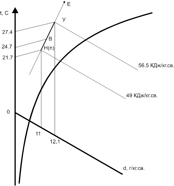 В переходный период предусмотрена рециркуляция воздуха. По параметрам наружного воздуха (tН=8°С, IН=22,5 кДж/кг.св) строим точку Н (рис.2). Для построения точки У находим расчетное приращение влагосодержания воздуха: