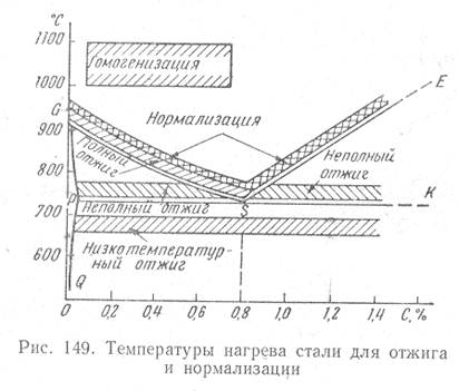 Полный отжигПолный отжиг характеризуется нагревом на 20-30 град выше температуры интервала превращений и медленным охлаждением до температуры ниже интервала превращений (обычно до 400 - 5000 С). Полному отжигу подвергают доэвтектоидные и эвтектоидную стали. Для заэвтектоидных сталей целесообразным и практически применимым является неполный отжиг. Полный отжиг применяют для перекристаллизации структуры в горячодеформированных сталях и фасонном литье. Отжиг горячедеформированной стали снижает прочность и повышает пластичность. Если исходная структура трудно поддается исправлению и полный отжиг не в состоянии улучшить структуру стали, то применяют двойной отжиг. Первый высокий отжиг проводят при повышенной температуре 950-1000° С. Неполный отжиг применяют преимущественно для заэвтектоидиой стали. Неполный отжиг доэвтектоидных сталей применяют для поковок, горячая обработка давлением которых проведена правильно с получением удовлетворительной микроструктуры. В этом случае назначением неполного отжига является перекристаллизация перлита и снятие внутренних напряжений перед механической обработкой. Температура нагрева при неполном отжиге доэвтектоидных сталей 770 - 800о С. Изотермический отжиг При изотермическом отжиге аустенит превращается в феррито-цементитную смесь не при охлаждении в определенном интервале температур, как это происходит при обычном полном отжиге, а вовремя выдержки при постоянной температуре. Для изотермического отжига сталь нагревают до оптимальной температуры и после выдержки быстро охлаждают до температуры немного ниже критической точки (650-7000 С). При этой температуре сталь выдерживают до полного распада аустенита, а затем охлаждают на воздухе. Преимуществом изотермического отжига по сравнению с обычным является значительное сокращение времени отжига и получение более однородной структуры. Температура изотермической выдержки значительно влияет на получающуюся структуру и свойства. С понижением температуры, т.е. с увеличением степени переохлаждения аустенита, зерна цементита измельчаются, и получается более дисперсный перлит. Практически изотермический отжиг проводят в двух печах: в одной печи детали нагревают, затем их переносят в другую печь, имеющую температуру немного ниже. Низкотемпературный отжиг. Низкотемпературный отжиг (высокий отпуск) применяют главным образом для легированных сталей (хромистых, хромоникелевых и др.) для снятия внутренних напряжений и для снижения твердости. Фазовая перекристаллизация при этом виде отжига отсутствует. Полного снятия внутренних напряжений достигают при нагреве до 6000 С, поэтому низкотемпературный отжиг можно проводить в температурном интервале от 6000 С. Выдержка для снятия внутренних напряжений тем меньше, чем выше температура нагрева. Охлаждение после нагрева должно быть достаточно медленным, чтобы вновь не возникли внутренние напряжения. Диффузионный отжиг (гомогенизация) Этот отжиг характеризуется нагревом до температуры значительно выше температур интервала превращений (на 180 - 300° С) с последующим медленным охлаждением. Такой отжиг применяют для выравнивания химической неоднородности зерен твердого раствора путем диффузии, т.е. уменьшения микроликвации в крупных фасонных стальных отливках и слитках, главным образом легирова