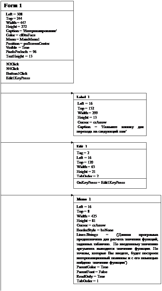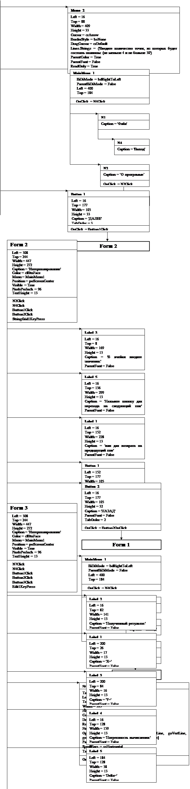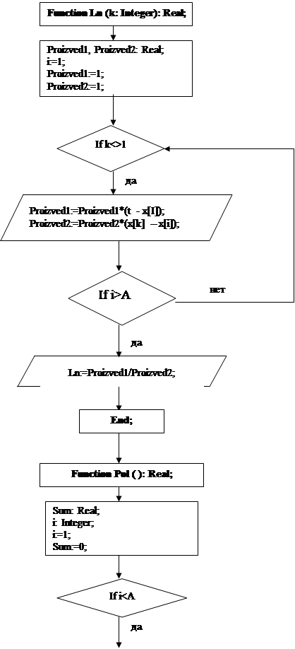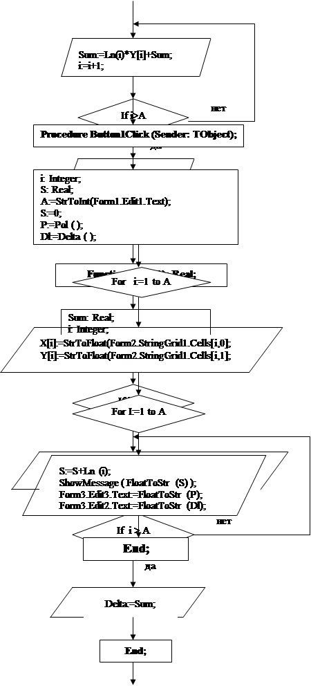 end. unit unit3; interface uses Windows, Math, Messages, SysUtils, Variants, Classes, Graphics, Controls, Forms, Dialogs, StdCtrls, Menus, ComCtrls; type TForm3 = class(TForm) Label2: TLabel; Edit1: TEdit; Memo1: TMemo; Edit3: TEdit; Label1: TLabel; MainMenu1: TMainMenu; N1: TMenuItem; N4: TMenuItem; N7: TMenuItem; Button1: TButton; Button2: TButton; Button3: TButton; Label3: TLabel; Label4: TLabel; Label5: TLabel; Edit2: TEdit; procedure Edit1KeyPress(Sender: TObject; var Key: Char ); procedure N4Click(Sender: TObject); procedure N7Click(Sender: TObject); procedure Button1Click(Sender: TObject); procedure Button2Click(Sender: TObject); procedure Button3Click(Sender: TObject); private { Private declarations tion } public { Public declarations } end; var Form3: TForm3; i, j, A, k: Integer; Y, X: array [1..30] of Extended; t, P, Dl: Real; implementation uses Unit1, Unit2, Unit6; {$R *.dfm} procedure TForm3.Edit1KeyPress(Sender: TObject; var Key: Char); // Integer begin if not(key in ['0'..'9']) then Key:=#0; end; procedure TForm3.N4Click(Sender: TObject); begin Close; end; procedure TForm3.N7Click(Sender: TObject); begin AboutBox.ShowModal; end; function Ln(k: integer): Real; var Proizved1, Proizved2: Real; begin t:=StrToFloat(Form3.Edit1.Text); i:=1; Proizved1:=1; Proizved2:=1; repeat if k<>i then begin Proizved1:=Proizved1*(t-x[i]); Proizved2:=Proizved2*(x[k]-x[i]); end; i:=i+1; until i>A; Ln:=Proizved1/Proizved2; end; function Pol( ): Real; var Sum: Real; i: Integer; begin i:=1; Sum:=0; repeat Sum:=Ln(i)*Y[i]+Sum; i:=i+1; until i>A; Pol:=Sum; end; function Delta( ): Real; var Sum: Real; i: Integer; begin i:=1; Sum:=0; repeat Sum:=ABS(Ln(i))*0.0002+Sum; i:=i+1; until i>A; Delta:=Sum; end; procedure TForm3.Button1Click(Sender: TObject); var i: Integer; S: real; begin A:=StrToInt(Form1.Edit1.Text); S:=0; for i:=1 to A do begin X[i]:=StrToFloat(Form2.StringGrid1.Cells[i,0]); Y[i]:=StrToFloat(Form2.StringGrid1.Cells[i,1]); end; P:=Pol(); Dl:=Delta(); for i:=1 to A do S:=S+Ln(i); ShowMessage(FloatToStr(S)); Form3.Edit3.Text:=FloatToStr(P); Form3.Edit2.Text:=FloatToStr(Dl); end; procedure TForm3.Button2Click(Sender: TObject); begin Form3.visible:=false; Form2.visible:=true; end; procedure TForm3.Button3Click(Sender: TObject); begin Close; Form2.Close; Form1.Close; end; end. unit Unit6; //AboutBox interface uses Windows, SysUtils, Classes, Graphics, Forms, Controls, StdCtrls, Buttons, ExtCtrls; type TAboutBox = class(TForm) Panel1: TPanel; ProductName: TLabel; Version: TLabel; Copyright: TLabel; Comments: TLabel; Image1: TImage; BitBtn1: TBitBtn; private { Private declarations } public { Public declarations } end; var AboutBox: TAboutBox; implementation {$R *.dfm} end. Приложение 2. Блок-схема программного средства: