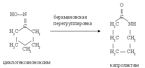 Далее оксим циклогексана в кислой среде (олеум) претерпевает перегруппировку Бекмана, характерную для оксимов многих кетонов. В результате такой перегруппировки происходит разрыв углерод-углеродной связи и расширение цикла; при этом атом азота входит в цикл: