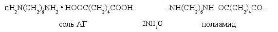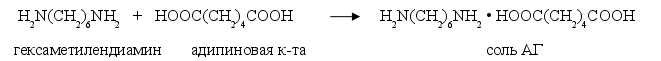 2 Окисление циклогексана проводят кислородом воздуха в жидкой фазе при 130-140oС и 15-20 кгс / см2 в присутствии катализатора – стеарата марганца. При этом образуются циклогексанон и циклогексанол в соотношении 1:1. Циклогексанол дегенерирует до циклогексанона, а последний превращается в капротам описанным выше способом. При строительстве новых и расширении существующих производств капролактама будет использоваться преимущественно вторая схема его получения. При этом окисление циклогексанона воздухом будет интенсифицировано за счет повышения температуры реакции до 190-2000С, что существенно сократит продолжительность реакции. Полимеризацию капролактама ведут на тех заводах, которые производят синтетическое волокно. Капролактам перед полимеризацией расплавляют. Для предотвращения окисления лактама процесс полимеризации протекает при 15-16 кгс/см2 при температуре около 2600С, проводят в атмосфере азота. Образовавшийся в результате полимеризации капролактама полимер застывает в белую роговидную массу, которую затем измельчают и обрабатывают водой при повышенной температуре для измельчения не прореагировавшего мономера и образовавшихся димеров и тримеров. Для формирования волокна капрона высушенный полимер загружают в закрытые стальные аппараты, снабженные решетками, на которых он расплавляется при 260-2700С в атмосфере азота. Отфильтрованный под давлением сплав поступает в фильеры. Образующиеся после выхода из фильеры волокна охлаждают в шахте и наматывают на бобины. Сразу с бобин пучок волокон направляют на вытяжку, крутку, промывку и сушку. Волокно капрон по внешнему виду напоминает натуральный шелк; по прочности оно значительно превосходит его, но несколько менее гигроскопично. Это волокно находит широкое применение для изготовления высокопрочного корда, тканей, чулочных и трикотажных изделий, канатов, сетей и др. Волокно нейлон (анид). Получается из полиамида – продукта поликонденсации так называемой соли АГ (гексаметилендиаминадипинат). Соль АГ получается взаимодействием адипиновой кислоты с гексаметилендиамином в метаноле: