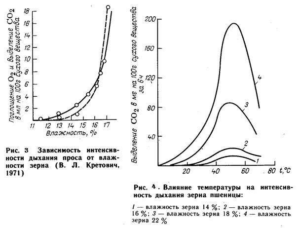 образование тепла в зерновой массе особенно при высокой интенсивности аэробного дыхания мотает быть весьма существенным. Известно, что зерновая масса обладает низкой теплопроводностью, поэтому образующееся тепло вызывает повышение температуры и, следовательно, интенсивности дыхания. Два последних названных следствия дыхания являются причинами возникновения самосогревания зерновой массы, приводящего ее к порче, а иногда и к полной гибели. Самосогревание - результат высокой интенсивности дыхания зерновой массы, развития в ней плесеней, а иногда и амбарных вредителей. В начальной стадии самосогревания (повышение температуры до 30 'С) зерно приобретает солодовый запах и сладковатый вкус, свойственные прорастающему зерну. Поверхность зерна сначала обесцвечивается, затем приобретает красноватый оттенок, а эндосперм - сероватый. В нем повышаются доля моносахаридов, титруемая кислотность и кислотное число жира. Активность ферментов существенно возрастает. Объемный выход хлеба снижается, мякиш получается более темным, чем из нормального зерна. При переработке пшеницы с солодовым запахом ее смешивают с нормальным зерном. При развитии самосогревания и повышении температуры до 40 - 50 'С и выше поверхность зерна темнеет вплоть до полного почернения, иногда полностью покрывается мицелием плесеней. Темнеет, а затем чернеет эндосперм. Запах становится плесневым, а потом гнилостно-затхлым, изменяется соответственно и вкус, увеличиваются титруемая кислотность (в болтушке), кислотное число жира, растет содержание аммиака. Интенсивность дыхания достигает максимума и начинает падать, снижается всхожесть зерна вплоть до полной ее утраты. Содержание клейковины в пшенице резко снижается, а ее качество ухудшается. Эти изменения говорят о распаде в греющемся зерне углеводов, белков и липидов под действием собственных и плесневых ферментов, а также длительным воздействием повышенных температур. Если самосогревание возникает в поверхностном слое насыпи (до 0,7 м от поверхности), то главной причиной порчи зерна является его плесневение. При возникновении самосогревания в глубинных слоях бурное развитие плесеней задерживается недостатком там кислорода, поэтому основной причиной порчи являются деятельность собственных ферментов и высокая температура. Мука из зерна поверхностных очагов самосогревания дает хлеб плоский, почти без пор, с очень темным заминающимся мякишем, а из глубинных очагов самосогревания - высоким, с рваными корками. Зерно, подвергшееся самосогреванию больше, чем в первой стадии, на пищевые (иногда и кормовые) цели не используется. В период хранения постоянно проводят наблюдения за зерном. Температура хранящейся зерновой массы должна находиться под повседневным контролем. При небольшом повышении температуры (на 1 - 3 С) проводят активное вентилирование сухим холодным воздухом. Если зерно после этого продолжает греться, то его приходится перемещать в резервный силос, пропуская при этом через зерносушилку и зерноочистительную машину (для охлаждения). Поверхностный слой зерна не реже одного раза в неделю осматривается для определения присутствия (или отсутствия) признаков появления амбарных вредителей. При их обнаружении принимаются срочные меры по обеззараживанию зерновой массы и предупреждению их перехода в 