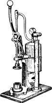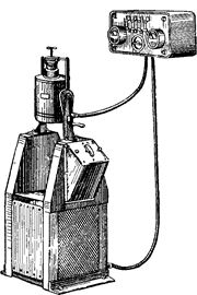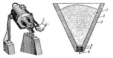 Рис.3. Литейный аппарат Рис.4. Прибор для литья под с использованием давления давлением водяных паров. сжатого воздуха. или мольдином металлическую крышку, прикрепленную к ручке аппарата, а кювету устанавливают на подставке под крышкой: когда металл расплавится, ручкой надавливают на крышку, которая закрывает всю поверхность кюветы. Повышение давления создается при испарении влажного асбеста или мольдина. Для этой же цели применяют аппараты, действующие по принципу центробежной силы. Несмотря на то, что существует много центробежных аппаратов, работающих при помощи электричества, наиболее широкое распространение получила ручная центрифуга, имеющая весьма простое устройство. В деревянной ручке укрепляют неподвижно винт, на который надевают при помощи подвижного крючка железную проволоку толщиной 3-4 мм и длиной 15-20 см. На конце проволоки имеется петля, соединяющаяся подвижно с дугой, на концах которой находится металлическая чашка для установки кюветы во время отливки. Кювету нагревают и вставляют в эту чашку, а в воронку кюветы помещают золото. При помощи паяльного аппарата направляют струю пламени на золото до его расплавления. Затем центрифугу приводят в движение, и после 3-4 поворотов металл вгоняется в кювету. Во время расплавления золота к нему во избежание окисления добавляют порошок буры. В последнее время для заполнения кюветы формовочной массой применяется вибрация литейной формы. Вместо золота в зубопротезном деле начали широко применять нержавеющую сталь марок Х18Н9 и ЭИ95. Протезы из стали отливают по методу выплавляемых моделей. Для литья деталей зубопротезных конструкций необходимо произвести следующие операции: 1) вклеивание литников из металлической проволоки диаметром 2-2,5 мм и длиной 3-3,5 см в нерабочую часть восковых моделей; 2) соединение восковых моделей в общий блок и приклеивание его литниками к деревянному конусу, покрытому воском; 3) покрытие восковых моделей огнеупорной оболочкой; 4) покрытие металлической опокой-кюветой деревянного конуса с восковыми моделями; 5) заливка формовочной массой на моторе-вибраторе опоки с восковыми моделями; 6) удаление литников из опоки и выплавление восковых моделей в муфельной печи; 7) обжиг формы в опоке; 8) расплавления стали и заливка ею формы; 9) удаление отлитых деталей из опоки и очистка их от формовочной массы; 10) отделение литников от деталей и окончательная очистка их от огнеупорной массы с помощью металлической щетки на шлифовальном круге. В крупных лабораториях восковые модели делают в большом количестве и их комбинируют «в елку». Формовочной массой для литья стали служит состав из 90% корунда (минутник №10) и 10% гипса. Для покрытия восковых моделей огнеупорной оболочкой перед их формовкой в кюветах приготовляют раствор, состоящий из 2% целлулоида (рентгеновская пленка или кинопленка) и 98% ацетона. К этому раствору добавляют минутник №30 до состояния жидкой кашицы. Если нет тонкого минутник, можно применять тонкий кварц. Может быть также использована смесь из одной части гидролизованного этилсиликата и двух частей маршалита. С 1951 г. стали применять смесь из 90% кристаллического кварцита и 9% окиси кальция. Смесь замешивают на 1-процентном водном растворе жидкого стекла. Выплавление восковых моделей проводят в муфельных печах при температуре 600-800 градусов в т
