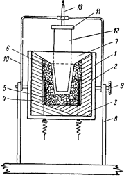 Промежуток между тиглем и керамической футеровкой заполнен криптолом — мелкими кусочками графитизированного или угольного электродного боя величиной 5—6 мм. При включении тока между кусочками графита возникают вольтовы микродуги и выделяется значительное количество тепла, что ведет к нагреву огнеупорного тигля, в котором находится сталь; последняя начинает плавиться. Углубление в цилиндре закрыто керамической крышкой 7 с отверстием в центре. Электропечь укреплена на двух стойких 8, на оси которых с правой стороны находится рукоятка 9 для поворота печи при заливке стали в опоку. Когда сталь в тигле расплавлена, на керамическую Рис.5. Схема устройства крышку устанавливают кювету 12, которую плотно при- для плавки стали жимают подвижной дугой 10 цилиндрического фланца 11. системы Д. Н. Цитрина Фланец имеет трубку, соединенную с вакуум-насосом спомощью резинового шланга, через который отсасываются газы и создается отрицательное давление в опоке.Вакуум-насосы могут быть водоструйными и механическими. Водоструйный насос состоит из двух резиновых шлангов 13, стеклянной бутыли и вакуумметра. В комплект электропечи входят: понижающий трансформатор на 30, 45, 60, 75, 90 в и 40, 50 а, реостат, вольтметр, амперметр и термопара с гальванометром. Питание электропечи осуществляется от электросети.
