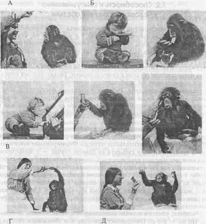 Рис. 1. Реакция на зеркало у детеныша шимпанзе и ребенка (из работы Н. Н. Ладыгиной-Котс). Когда Надежда Николаевна передвинула зеркало, он пытался вырвать его из рук (рис. 1 Г), грызть край, старался заглянуть за него, заводил туда руку, нащупывая и пытаясь захватить того, кто там находится. Наткнувшись за зеркалом на руку человека, он попытался подтянуть ее к себе, а встретив сопротивление, впал в агрессию и стал колотить по стеклу сложенными пальцами. Впоследствии, когда зеркало попадалось Иони на глаза, он часто колотил по нему кулаками, впадал в гнев, а когда зеркало убирали, грозил ему вслед (рис.1Д). Такая реакция так и не изменилась до самой гибели животного (его возраст не превышал к тому времени 4 лет). Приблизительно так же реагировали на свое отражение и другие молодые обезьяны, например шимпанзе Гуа, которую американские психологи супруги Келлоги в течение почти года воспитывали вместе с ее ровесником — их собственным сыном Дональдом. Оба годовалых малыша совершенно не понимали, что существа перед ними — это они сами. Это и неудивительно, так как, по данным более поздних работ, у ребенка способность узнавать себя в зеркале формируется далеко не сразу, проходя целый ряд стадий. У человекообразных обезьян она возникает только в возрасте в 2—2,5 года, а полностью проявляется к 4,5 — 5 годам (Povinelli et al., 1994).