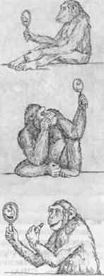 Рис. 4. Подросток шимпанзе, выпущенный в природные условия в Псковской области, рассматривает свое отражение в воде (Фирсов, 1977). Более убедительный ответ на вопрос, как относятся животные к своему отражению в зеркале, был получен в специально проведенных опытах. В экспериментах Гордона Гэллопа (Gallop, 1970, 1994) нескольким шимпанзе под легким наркозом наносили небольшие пятнышки краски на одну из бровей и на противоположное ухо. Очнувшись после этой несложной процедуры, они прикасались к окрашенным участкам тела не чаще, чем к остальным, т. е. не ощущали физических последствий этой манипуляции. Однако, увидев себя в зеркале, шимпанзе начинали активно ощупывать окрашенные места. Следовательно, они понимали, что видят в зеркале себя, помнили как выглядели раньше, и осознавали, что в их облике произошли изменения. Выводы Гэллопа нашли подтверждения в нескольких десятках работ, которые подробно освещены в книге М. Томазелло и Дж. Колла (Tomasello, Call, 1998). В них были получены многочисленные подтверждения того, что шимпанзе и другие антропоиды использовали зеркало по назначению: с его помощью чистили те части своего тела, которые другим путем увидеть невозможно. Наряду с этим были получены столь же убедительные свидетельства того, что низшие узконосые обезьяны такими способностями не обладают, т.е. не могут узнавать себя в зеркале. Эксперименты объективно свидетельствуют, что антропоиды могут рассматривать себя как некий самостоятельный объект, т.е. у них имеются элементы самоузнавания и они могут абстрагировать понятие собственного «Я». 3. Самоузнавание и использование другой информации, полученной с помощью зеркала, у животных других видов. Вполне очевидно, что для анализа предыстории человеческого сознания наиболее интересны наблюдения и результаты исследований, проведенных с человекообразными обезьянами. В то же время представлялось необходимым выяснить, есть ли элементы самоузнавания у животных других видов, прежде всего у тех, кто имеет сложный высокодифференцированный мозг. Об этом известно гораздо меньше, однако, по-видимому, большинство из изученных видов (рыбы, морские львы, собаки, кошки, слоны и попугаи) оказались не способными узнавать себя в зеркале (Povinelly et al., 1993). Эти животные, как правило, реагируют на свое отражение как на другое животное. Характер их реакции зависит от ситуации и настроения. В одних случаях они нападают на отражение, принимая его за соперника. Так ведут себя многие виды рыб, которые сражаются с воображаемым конкурентом. Другие животные, наоборот, начинают «ухаживать» за отражением. Именно так поступают волнистые попугайчики, которым обычно помещают в клетку зеркальце: они воспринимают отражение как сородича, за которым можно ухаживать. Выпущенная полетать, такая птица проводит массу времени около зеркала и исправно «кормит» свое отражение. Попугаи-жако характеризуются более высоким уровнем структурно-функциональной организации мозга, чем волнистые, а также развитой способностью к обобщению и адекватному использованию символов (см. гл. 6). И. Пепперберг и ее коллеги подробно исследовали обращение с зеркалом у двух молодых (7,5 и 11 месяцев) жако (Pepperberg et al., 1995). Птицы были выращены в неволе и свое зеркальное отражение могли видеть, лишь когда в раковине в лаборатории собиралась вода. Как и многие другие жи