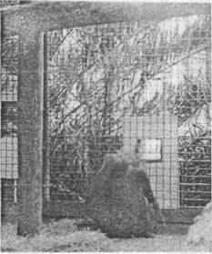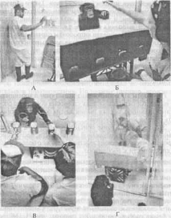 Рис. 5. Существует ли у шимпанзе связь между тем, что они видят, и тем, что известно (или неизвестно) другим? Пояснения в тексте. Фотография любезно предоставлена доктором Д. Повинелли (Йельс-кий университет, Коннектикут, США). Шимпанзе способны мысленно оценить ту информацию, которой обладает (или не обладает) партнер. Способность человекообразных обезьян «поставить себя на место другого» сравнивали с возможностями приматов других видов, в частности макаков-резусов, не узнающих себя в зеркале. Обладают ли этим свойством макаки-резусы, показывает тест на «перемену ролей» (Povinelli et al., 1991; 1992). Опыт заключается в следующем. Экспериментальная установка напоминает детскую настольную игру в хоккей, где пара игроков передвигает фигурки и манипулирует мячом с помощью нескольких специальных стержней. Достичь результата (получить приманку) два животных могут, лишь вместе выполняя определенные действия, причем каждое — свои. Таким образом, каждая обезьяна выучивает свою роль в этом взаимодействии. Затем животных меняют местами, и теперь они должны выполнять те действия, которые раньше выполнял партнер, т.е. происходит «смена ролей». В экспериментах Д. Повинелли антропоиды справлялись с ней успешно и практически сразу начинали правильно выполнять новые функции. Это означает, что на предыдущих стадиях обучения они наблюдали за действиями партнера и, оказавшись на его месте, быстро воспользовались приобретенным опытом. В отличие от антропоидов, макаки-резусы в новой ситуации должны были «выучивать роль» сызнова — использовать опыт партнера они не могли. Результаты этих опытов свидетельствуют о коренных различиях человекообразных и низших узконосых обезьян по способности к самоузнаванию, оценке знаний других особей и умению «поставить себя на место сородича». Это совпадает с ранее описанными данными о более примитивном характере их орудийной деятельности, неспособности планировать результаты своих действий, а также о более низком уровне их способности к обобщению. Обнаружив столь принципиальные различия поведения человекообразных и мартышковых обезьян в тесте со «сменой ролей» и в других подобных тестах, Д. Повинелли обратился к поиску лежащих в их основе психофизиологических особенностей. Иными словами, почему способность к самоузнаванию присуща только человекообразным обезьянам и ее нет у других приматов? Эти различия нельзя, по-видимому, объяснить сложностью социальной структуры: у многих низших узконосых обезьян сообщества не менее сложны, чем у человекообразных обезьян. Невозможно объяснить такие различия и на основе видовых экологических особенностей, например, способов отыскания пищи определенного типа, поэтому Д. Повинелли (Povinelli, Cant, 1995) приходит к выводу, что причину различий надо искать в другом. Согласно гипотезе Повинелли, появлению самоузнавания способствует усиление произвольного контроля локомоции у человекообразных обезьян, которое, в свою очередь, обусловлено большой массой их тела. Когда эти животные перемещаются по тропическому лесу, им необходимо более часто и более тщательно, чем мелким обезьянам, оценивать предстоящий маршрут. Они должны уметь определять, может или нет выдержать их вес та или иная опора. Очевидно, что у мартышковых обезьян таких проблем не возникает. Возможно, что именно необходи