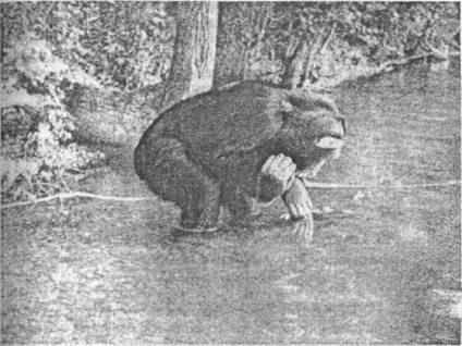 Рис. 3. Исследование реакции на зеркало у орангутана в условиях зоопарка. Фотография любезно предоставлена профессором Э. Тобак (Музей Естественной истории, Нью-Йорк, США). «Говорящие» обезьяны (см. гл. 6), впервые увидев себя в зеркале, радостно сигнализировали, что узнали себя. Шимпанзе Уошо (как до этого и Вики) хорошо узнавала себя на фотографиях, а других шимпанзе на фото именовала «черными тварями». «Говорящая» обезьяна Люси очень любила наблюдать, как ее воспитатель делал вид, что проглатывает очки. Этот несложный фокус приводил Люси в восторг, она следила за человеком с неослабевающим интересом и, похоже, с полным пониманием. Насмотревшись на фокус, обезьяна схватила очки и перемахнула в другой угол комнаты. По дороге она прихватила небольшое зеркало и, зажав его в ногах, несколько раз повторила трюк с очками, пронося их мимо рта со стороны лица, невидимой в зеркале — в точности так, как это делал ее воспитатель. Следует отметить, что для Люси зеркало было привычным и понятным инструментом, которым она адекватно воспользовалась даже в такой необычной ситуации. Описанные выше опыты и наблюдения проводились на обезьянах, живших в неволе или с очень раннего возраста, или с рождения. На фотографии (рис. 3) показана обстановка такого эксперимента. Еще более интересным было наблюдение за реакцией на собственное отражение человекообразных обезьян, живущих на воле. По наблюдениям Д. Фосси (1990), девятилетний самец гориллы (Дид-жит), стащив зеркальце, сначала стал обнюхивать его, не прикасаясь пальцами. Когда он увидел свое отражение, губы вытянулись в трубочку, а из груди вырвался глубокий вздох. Некоторое время Диджит с неподдельным удовольствием разглядывал его, а потом протянул руку и стал искать за зеркалом «обезьяну». Ничего не обнаружив, он молча смотрел в него еще минут пять, а потом вздохнул и отодвинулся. Фосси была удивлена, с каким спокойствием Диджит отнесся к зеркалу и с каким неподдельным удовольствием в него смотрелся. Узнал ли он себя, так и осталось для наблюдателя неясным, но поскольку никаких посторонних запахов при этом не было, то, вероятно, понял, что другой гориллы тут нет. По наблюдениям другого знатока поведения обезьян в природе — Дж. Гудолл (1992), многие дикие шимпанзе, в отличие от этой гориллы, при виде своего отражения в зеркале проявляют агрессию. Следует учесть, что возможность видеть свое отражение у живущих на воле обезьян крайне ограниченна. Известно, что шимпанзе не любят воды, а единственный способ видеть свое отражение в природных условиях — наклониться над водной поверхностью. Приведенная на рис. 4 фотография подростка шимпанзе, который играет на мелководье, зафиксировала довольно редкий эпизод.