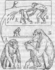 Рис. 2. Подражание действиям человека (см. текст, рисунок Т. Никитиной). Способность узнавать себя в зеркале появляется у шимпанзе в том же возрасте, что и целенаправленное употребление орудий, например, в описанном нами опыте с «ловушкой» (см. 4.5.1.3; Bard et al., 1995). В возрасте 4,5—5 лет многие шимпанзе, гориллы и орангутаны явно могут узнавать себя в зеркале, осознавать свое отличие от окружающих и пользоваться зеркалом во многом так, как это делают люди. Одновременно у них развивается и способность подражать ранее им незнакомым произвольным действиям. Например, шимпанзе Вики, воспитанная американскими психологами супругами Хейс, уже в двухлетнем возрасте, стоя перед зеркалом, мазала помадой губы (рис. 2), повторяя все движения, которые обычно делала ее хозяйка. Впоследствии она копировала более 55 поз и гримас, показанных ей на фотографиях, причем некоторые из них она никогда ранее не видела. В начале XX века (почти одновременно с Н. Н. Ладыгиной-Котс) английский ученый Уильям Фернесс приручил орангутана. Он подробно изучал его психику и пытался научить говорить. В течение 6 месяцев Фернесс ежедневно дрессировал своего питомца, заставляя выговаривать слово «папа» (в то время еще не было известно, что голосовой аппарат обезьян совершенно не приспособлен для столь тонкой артикуляции). Один из приемов обучения состоял в том, что он становился перед зеркалом вместе с орангутаном и многократно повторял это слово. «Подопечный» смотрел в зеркало, следил за губами «учителя» и сравнивал их с движениями собственных губ, т.е. пользовапся зеркалом вполне по назначению.