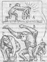 Рис. Эпизод «социального маневрирования» (пояснения см. в тексте, рисунок Т. Никитиной). В результате накопления такой информации и непосредственного опыта детеныш в конце концов выучивается «правильно вести себя» в различных ситуациях и предвидеть возможное влияние поведения — его собственного и союзников на других животных. Например, если детеныш видит, что обезьяна В атакует Г, он понимает, что Г может повернуться и напасть на него самого (на рис. 7 это изображено как «мысленное представление» у А), т.е. переадресовать агрессию. Если А способен предвидеть такой поворот событий, то он может избежать нападения Г: не попадать под горячую руку. Более того, если А, наблюдая взаимодействия между В и Г, понял, что В старше по рангу, то он сообразит, что В — более выгодный для него союзник против Г, чем Г как союзник против В. Накапливая такой опыт, детеныш шимпанзе приобретает способность ловко лавировать в самых разных ситуациях. Подобный тип отношений называют «социальным маневрированием» и «социальным манипулированием». Достоверно описаны ситуации, когда шимпанзе прибегают к некоторым уловкам, чтобы заставить сородича совершить нужное им действие или уклониться от нежелательного контакта или конфликта. С помощью таких уловок обезьяны достигают успеха в разных ситуациях: мать может отвлечь капризного детеныша от опасного действия; зачинщик беспорядков переадресует гнев доминанта на ни в чем не повинного сородича, а сам избегает справедливого наказания; обезьяна может предупредить конфликт и даже драку, отвлекая внимание соперников с помощью только что придуманной инсценировки; обезьяна, знающая источник пищи, может увести от него сородичей и затем воспользоваться им в одиночку и т.п. Из многих описанных Дж. Гудолл случаев упомянем о поведении молодого самца по кличке Фиган, который регулярно прибегал к самым разнообразным формам обмана сородичей в разных ситуациях. Особенно ярко проявились его способности, когда шимпанзе, приходивших в лагерь, стали регулярно подкармливать бананами с помощью особой кормушки. Чтобы открыть ее, нужно было отвинтить гайку и освободить рукоятку, тогда натяжение проволоки, фиксирующей крышку, ослабевало и кормушка открывалась. Беда была в том, что рукоятка была удалена от кормушки и открывшая ее обезьяна чаще всего не могла воспользоваться добычей, так как ее перехватывали «иждивенцы» — расположившиеся рядом с кормушкой взрослые самцы. (Подобную методику часто применяют для изучения способности животных к совместным действиям при добывании пищи. Фирсов использовал сходную установку, чтобы побудить шимпанзе к использованию орудий (см. 4.5). Из двух подростков, овладевших навыком открывания кормушки, только Фиган догадался, как обмануть «иждивенцев». Изображая полное безразличие, он потихоньку откручивал гайку, но делал вид, что не обращает на нее никакого внимания. При этом он незаметно придерживал рукой или ногой рукоятку, чтобы крышка не открылась раньше времени. Иногда он просиживат так более получаса, дожидаясь, пока разойдутся разочарованные конкуренты, и только тогда отпускал ручку и бежал за бананами. Впоследствии он изобретал все новые приемы, чтобы отвлечь остальных обезьян от места, где наблюдатели подкармливали их бананами. Такое поведение «преднамеренного обмана» принято 
