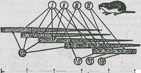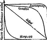 Абсолютная и удельная смертность характеризуют скорость убывания численности популяции вследствие гибели особей от хищников, болезней, старости и т. д. Различают три типа смертности. Первый тип смертности характеризуется одинаковой смертностью во всех возрастах. Выражается экспоненциальной кривой (убывающей геометрической прогрессии). Данный тип смертности встречается редко и только у популяций, которые постоянно находятся в оптимальных условиях. Второй тип смертности характеризуется повышенной гибелью особей на ранних стадиях развития и свойствен большинству растений и животных. Максимальная гибель животных происходит в личиночной фазе или в молодом возрасте, у многих растений — в стадии произрастания семян и всходов. У насекомых до взрослых особей доживает 0,3 — 0,5% от отложенных яиц, у многих рыб — 1 — 2% от количества выметанной икры. Третий тип смертности отличается повышенной гибелью взрослых, в первую очередь старых особей. Отличается он у насекомых, личинки которых обитают в почве, воде, древесине, а так же в других местах с благоприятными условиями, В экологии широкое распространение получило графическое построение «кривых выживания» (рис. 2). Откладывая по оси абсцисс продолжительность жизни в процентах от общей продолжительности жизни, можно сравнивать кривые выживания организмов, продолжительность жизни которых имеет значительные различия. На основании таких кривых можно определить периоды, в течение которых тот или иной вид особенно уязвим. Поскольку смертность подвержена более резким колебаниям и больше зависит от факторов окружающей среды, чем рождаемость, она играет главную роль в регулировании численности популяции. Различные типы кривых выживания. (рис.2)