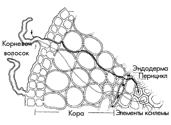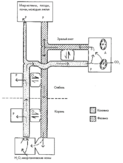 Рис. 3. Схема циркуляции воды, неорганических ионов и ассимилятов в растении. Вода и неорганические ионы, поглощенные корнем, передвигаются по ксилеме вверх с транспирационным током. Большая их часть транспортируется к листьям. В листьях значительное количество воды и неорганических ионов перемещается во флоэму и выносится из них вместе с сахарозой в токе ассимилятов. Буквой А обозначены места, специализированные на поглощении и ассимиляции исходных материалов из внешней среды. Буквы З и Р указывают соответственно места загрузки и разгрузки, О – точки, в которых происходит обмен между ксилемой и флоэмой Учитель (проверка заполнения таблицы). Вы верно заполнили таблицу, назвав вещества, транспортируемые растением, и указав путь этих веществ. Теперь вам предстоит более подробно ознакомиться с механизмом транспорта воды у растений. Начинается путь воды в растении с корня.