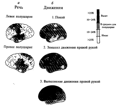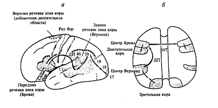 На рисунке в обобщенном виде представлена схема распределения системы, ответственной за речь, по Г. Шеперду (1987). Она основана на результатах электростимуляции речевых центров у нейрохирургических больных и анатомического изучения мозга обезьян и человека. Показаны структуры и их связи, с помощью которых выполняется функция называния. Зрительная информация сначала поступает в поле 17, затем она обрабатывается в полях 18 и 19. Отсюда перцептивный образ объекта передается в обширную заднюю речевую зону, в состав которой наряду с центром Вернике входит поле 39 (в теменной доле). Оно посылает информацию о зрительном образе предмета полю 22, где хранится его слуховой образ. Из поля 22 информация передается в речевую зону Брока, в которой находятся двигательные программы речи. Нужная программа считывается в моторную кору, которая и управляет речевой мускулатурой, обеспечивая сложную пространственно-временную координацию работы соответствующих мыщц, необходимую для того, чтобы мы могли назвать увиденный предмет. Спереди от роландовой (центральной) борозды находится область, ответственная за ритм речи и грамматику, — так называемая дополнительная (или добавочная) моторная область (ДМО). Больные с поражением этой области говорят без интонации, делают большие паузы между словами, путаются в грамматике, пропускают союзы, местоимения, нарушают грамматический порядок слов. Им легче пользоваться существительными, чем глаголами. Поражение данной области нарушает грамматическую обработку как произносимой, так и слышимой речи, что наводит на мысль о том, что здесь происходит «сборка» целых фраз. На рисунке можно видеть картину локального мозгового кровотока во время устной речи и его отличие от активации мозга при движении или только при его воображении — ритмического сжимания и разжимания правой руки, а также в состоянии покоя. Видно, что речь активирует как заднюю, так и переднюю речевые зоны. При представлении движения появляются очаги активации в лобной, теменной и височной коре. Однако в моторной коре (вдоль центральной борозды) активность пока незначительна. При выполнении движения фокус активации смещается в область моторной коры. В состоянии покоя можно видеть очаги активации в лобных долях, по-видимому, отражающие течение когнитивных процессов, не контролируемых заданием. Левые базальные ганглии — составная часть передней и задней систем речи. Известно, что базальные ганглии объединяют компоненты сложных движений в единое целое. По-видимому, сходную функцию они выполняют и в отношении речевых реакций, связывая слова в предложения. Передняя речевая область коры, похоже, связана с мозжечком, осуществляющим точное временное кодирование двигательных реакций. При поражении мозжечка возникает моторная и когнитивная дисметрия — плохое выполнение точных действий, включая когнитивные. Это указывает на причастность мозжечка к выполнению речевых и мыслительных операций. Таким образом, исследователи выделяют три основные функции речи: коммуникативную, регулирующую и программирующую. Эти функции выполняют важную роль для общения людей. Они обеспечивают общение между людьми с помощью языка, с их помощью человек овладевает собственным поведением, а так же правильно строит свое речевое высказывание, различные движения и действ
