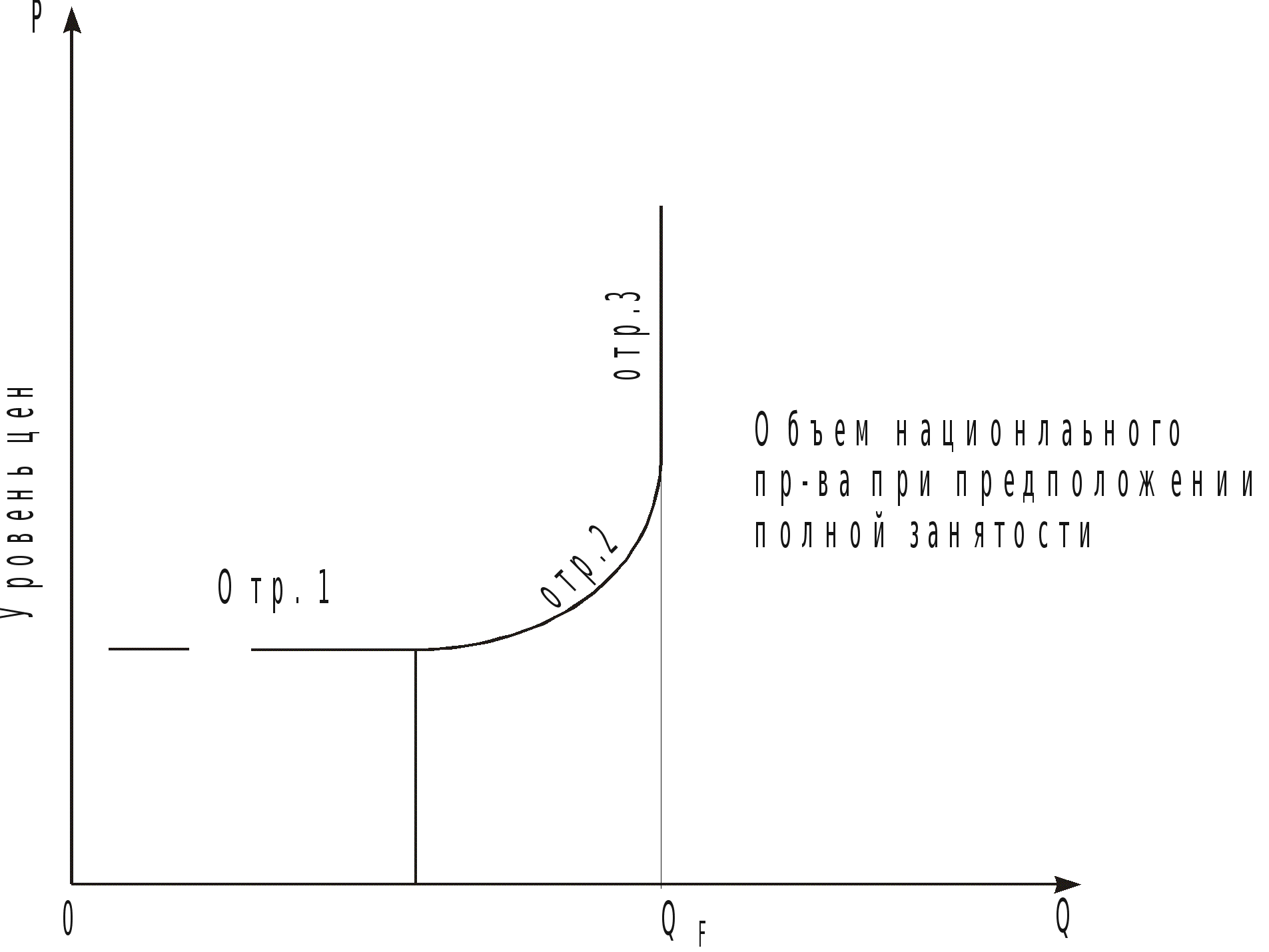 Веса потребительских товаров определяются на основе обследований семейных бюджетов (расходов семей), в соответствии со структурой потребления. Мерой инфляции является так же дефлятор Внутреннего Валового Продукта (ВВП) – это индекс цен, используемый для того, чтобы определять динамику ВВП, которая складывается в результате движения цен и изменения физического объема производства. Дефлятор призван устранить ценовые колебания при изменении динамики ВВП для выявления реального объема ВВП и соответствующей корректировки экономической политики. Дефлятор ВВП представляет собой отношение номинального ВВП, исчисленного в текущих ценах к реальному, то есть к ВВП в неизменных ценах. Оба показателя берутся в текущем периоде. Косвенным показателем инфляции могут служить: рост номинальной ставки процентов; прирост денежной массы в процентах (высокий темп прироста денежной массы стимулирует рост инфляции); темпы прироста денежной массы и динамика спроса на деньги, наличие и резервы золотых и валютных резервов, соотношение валютных резервов и денежной базы служат индикаторами раннего предупреждения, характеризующими степень устойчивости и ожидаемую динамику цен. [12; с. 425] Какова может быть инфляция? С теоретической точки зрения инфляция – это дисбаланс между совокупным спросом и совокупным предложением. Существует две альтернативные концепции такой инфляции: инфляция спроса, спровоцированная чрезмерным спросом при полной занятости (кейнсианская теория) и инфляция издержек, которая обусловлена ростом издержек производства (неоклассическая теория). Инфляция спроса подразумевает изменения в уровне цен посредствам избыточного совокупного спроса. В данном случае экономика может попытаться тратить больше, чем она способна производить; она может стремиться к какой-то точке, находящейся вне кривой своих производственных возможностей. Производственный сектор не в состоянии ответить на этот избыточный спрос увеличением реального объема продукции, потому что все имеющиеся ресурсы уже полностью использованы. Как следствие этот избыточный спрос приводит к завышенным ценам на постоянный реальный объем продукции. Суть инфляции спроса иногда объясняют одной фразой: «Слишком много денег охотится за слишком малым количеством товаров». Но соотношения между совокупным спросом, с одной стороны, и объемом производства, занятостью и уровнем цен – с другой, сложнее тех, которые имеет ввиду этот лаконичный комментарий. Рисунок 1 помогает объяснить эти сложности. На первом отрезке общие расходы, то есть сумма потребления, инвестиции, правительственных расходов и чистого экспорта, до такой степени низки, что объем национального продукта сильно отстает от своего максимального уровня при полной занятости. Другими словами, существует значительное отставание реального объема ВВП. Уровень безработицы высок, а большая доля производственных мощностей предприятий бездействует. Теперь предположим, что совокупный спрос повысится. Тогда объем производства увеличится, уровень безработицы снизится, а уровень цен возрастет незначительно или вовсе не изменится. Это объясняется тем, что существует огромное количество бездействующих трудовых и материальных ресурсов, которые можно ввести в действие при существующих на них ценах. Р