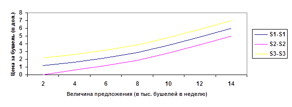 Данные о рыночном предложении, изображённые на рис. 3-4 в виде кривой S1, приведены в таблице 3-6. В ней сделано допущение, что для действующих на рынке 200 поставщиков характерны такие же шкалы предложения, как для производителя из табл. 3-5. Таблица 3-6 Рыночное предложение кукурузы, 200 производителей (в бушелях)