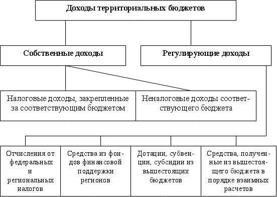Пункты 1, 3, 7 – по ставкам, установленным законодательством ( с 01.01.2000г. ставки налогов изменены). Для обеспечения расходов территориальных бюджетов (республиканских, республик в составе РФ, краевых, областных, окружных, местных) они должны иметь соответствующие доходы. Доходы территориальных бюджетов состоят из собственных и регулирующих. Собственные доходы бюджетов – виды доходов, закрепленные на постоянной основе полностью или частично за соответствующими бюджетами законодательством РФ. Это налоговые доходы, закрепленные за соответствующими бюджетами, бюджетами государственных внебюджетных фондов законодательством РФ, и неналоговые доходы, определенные нормативными актами, а также безвозмездные перечисления. Собственные доходы составляют меньшую часть доходов территориальных бюджетов. Для финансового обеспечения выполнения возложенных на региональные местные органы власти функции, экономического и социального развития территорий, сбалансированности территориальных бюджетов им из бюджетов вышестоящего уровня в порядке бюджетного регулирования передаются регулирующие доходы. Регулирующие доходы – это федеральные и региональные налоги и иные платежи, по которым устанавливаются нормативы отчисления (в процентах) бюджеты субъектов РФ или местные бюджеты на очередной финансовый год, а также на долговременной основе (не менее чем на 3 года) по разным видам таких доходов.