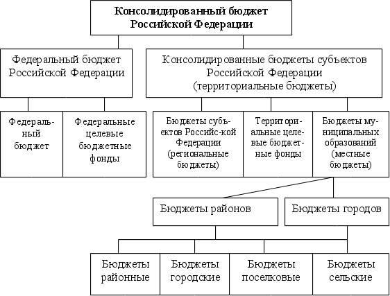 Бюджетная система Российской Федерации включает: федеральный бюджет, 21 республиканский бюджет республик в составе РФ, 55 краевых и областных бюджетов и бюджеты Москвы и Санкт-Петербурга, один областной бюджет автономной области, 10 окружных бюджетов, автономных округов и около 29 тысяч местных бюджетов (районные, городские, поселковые и сельские бюджеты). Схему бюджетной системы Российской Федерации иллюстрирует рис.1.