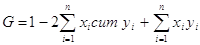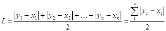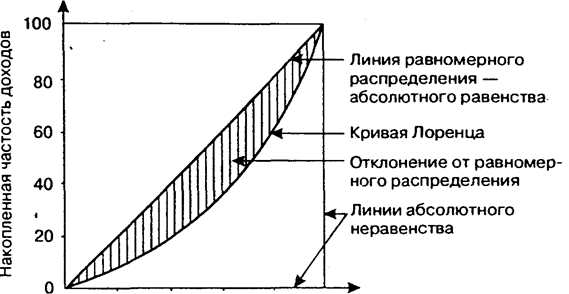 где уi — доля доходов, сосредоточенная у i-й социальной группы населения; хi — доля населения, принадлежащая к i-й социальной группе в общей численности населения; п — число социальных групп. Экстремальные значения коэффициента Лоренца: L = 0 в случае полного равенства в распределении доходов; L = 1 — при полном неравенстве. Об относительном неравенстве в распределении дохода может свидетельствовать доля площади отклонения от равномерного распределения (абсолютного равенства, т. е. площади сегмента, образуемого кривой Лоренца и диагональю квадрата, в половине площади этого квадрата). Коэффициент Джини: