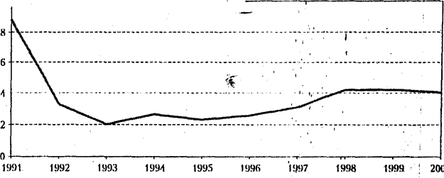 В-третьих, склонность к сбережению в наличной валюте, которая упала после кризиса из-за того, что для многих доллар стал "не по карману", в 2000 г., несмотря на восстановление доходов, оставалась отрицательной (-2,5%). Укрепление рубля в реальном выражении удерживало население от приобретения валюты для целей сбережения. 2000 год характеризовался позитивными изменениями в экономической, политической и социальной сферах, однако их влияние на сберегательную стратегию населения оказалось не очень весомым: нынешние стратегии населения можно охарактеризовать как предельно осторожные. Если люди и откладывают часть своих денежных средств (норма сбережений невысока), то предпочитают вклады в Сбербанк или наличные рубли (активы с низкой доходностью) на короткий срок. И все это происходит несмотря на значительный экономический рост в России в 2001 г. и первой четверти 2002г. Рис. 4 Склонность к сбережению в коммерческих банках и трудовые доходы населения