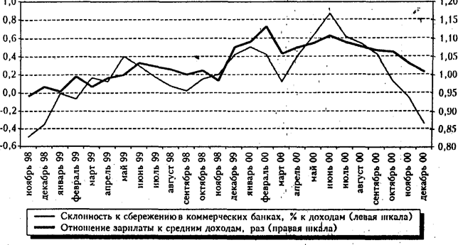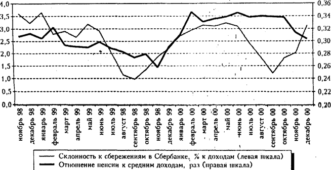 Во-первых, склонность к организованным сбережениям в банковской системе (в рублях и в валюте) в 2000 г. достигла 4,2%, значительно опередив уровень 1997 г. (2,5%), что обусловило существенный рост доли организованной части текущих сбережений (с 24 до 73% за тот же период) и рост их доли в накопленных сбережениях до 37,2%. Во-вторых, доля Сбербанка во вкладах населения выросла благодаря кризису до 73-74%, и даже с восстановлением нормального функционирования коммерческих банков практически не имеет тенденции к уменьшению. На поведение вкладчиков Сбербанка в большей степени влияют номинальные ставки; однако, как показал опыт лета 1999 г., они в течение нескольких месяцев привыкли к новым ставкам, и склонность к сбережению восстановилась. Новая закономерность характеризует динамику восстановления склонности к рубленым депозитам в коммерческих банках. Если до кризиса величина вкладов практически не была связана с динамикой традиционных (трудовых) доходов населения, то в последние два года появились признаки того, что круг вкладчиков расширяется в том числе за счет людей, получающих легальную зарплату. Хотя ее средний уровень (около 80 долл.) недостаточен для ускоренного формирования сбережений, в отдельных отраслях промышленности (нефтяной и газовой) летом 2000 г. средняя зарплата уже достигала 300-400 долл., что позволяет говорить о достаточно высоком сберегательном потенциале Рис. 3 Склонность к сбережению в Сбербанке и доходы пенсионеров