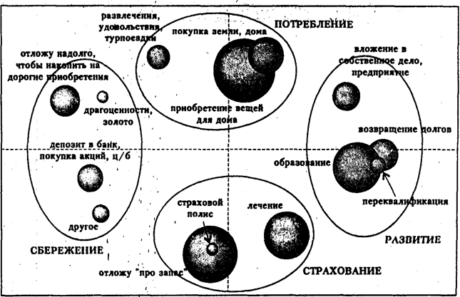 В 2000 г. ситуация в некоторой степени переломилась. Впервые с конца 1995 г. снизилась популярность такой формы хранения денежных средств, как наличная валюта: с 53 до 42%. Одновременно возросла доля людей, отдающих предпочтение наличном рублям: с 16 до 24%. Это связано, по-видимому, с тем, что валютный курс рубля оставался в течение последнего года достаточно стабильным. Несколько увеличилось число людей, готовых положить деньги/на депозитный вклад в Сбербанке (с 25 до 29%) или коммерческом банке (с 1,4 до 2,6%). Чем же обусловлен выбор конкретной инвестиционной, стратегии тем или иным домохозяйством? Представляется, что на него влияют не только материальное положение семьи (уровень текущих доходов, размер накоплений и наличие в семье товаров длительного пользования) и ситуация в стране (инвестиционный климат), но и ряд других факторов - социальных и психологических, которые могут играть не меньшую, а порой даже и более значимую роль, чем "экономические". К таким факторам можно в первую очередь отнести: · уровень доверия к государству и различным финансовым институтам; · опыт финансового поведения в прошлом (участие в "пирамидах", покупка акций, ценных бумаг) и его субъективная оценка ("выиграл" или "проиграл"); · оценка текущей ситуации в стране (ее благоприятность для осуществления сбережений) и представления о ее возможных изменениях в будущем (оптимизм/пессимизм); · склонность индивида к риску; · знание основных финансовых инструментов, информированность о возможностях вложений; · информационные источники, используемые при принятии решения о вложении денежных средств. 5. Социологические исследования склонности населения к сбережениямДля того чтобы оценить склонность населения к сбережениям, в специализированном опросе (ВЦИОМ, 2001 г.) был поставлен следующий вопрос. Предположим, что Вы, Ваша семья располагаете денежной суммой в размере 20 тыс. руб. Как Вы, скорее всего, распорядитесь этими деньгами? (не более 2-х ответов). Ответы на него позволяют оценить склонность респондентов к сбережениям и инвестициям безотносительно к их текущему уровню дохода. Среди предложенных вариантов ответа самым популярным оказался "потрачу на приобретение вещей для дома": так заявили 36% опрошенных. 29% отложили бы эту сумму "про запас". Следом идут такие варианты, как "на свое образование и развитие детей" (22%), "на свое мнение и лечение близких родственников" (19%), "постараюсь добавить и приобрести участок земли, домик и т.п." (12%). Анализ ответов респондентов с использованием процедур многомерного шкалирования показал, что у населения существуют четыре наиболее распространенные стратегии использования денежных средств. Их условно можно назвать потребление, сбережение, страхование и развитие. Графически схема предпочтений респондентов среди различных способов использования крупной денежной суммы представлена на рисунке 6. Те варианты, которые люди чаще всего называют одновременно в своих ответах, расположены на рисунке близко друг к другу, и, наоборот, если какие-либо способы вложения денег практически никогда не называются вместе, то на рисунке они находятся далеко друг от друга. Рис. 6 Предпочтения в использовании крупной денежной суммы