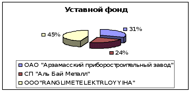 Уставной капитал совместного предприятия, согласно уставу составляет 150 000 долларов США. Уставной капитал создается за счёт взноса учредителей в размере: 67 500 долларов США - ООО «RANGLIMETELEKTRLOYYIHA», что составляет 45% от Уставного капитала. Вносится в форме передачи в срочное пользование на 10 лет производственных, складских и конторских помещений общей площадью 260 квадратных метров, а также помещения под фирменный магазин площадью 40 квадратных метров; 36 000 долларов США – СП «Аль Бай Металл», что составляет 24% от Уставного капитала. Вносится в форме денежных средств; 46 500 долларов США – ОАО «Арзамасский приборостроительный завод», что составляет 31% от Уставного капитала. Вносится в форме передачи технологического, испытательного и поверочного оборудования, технической документации. ОАО «Арзамасский приборостроительный завод», ведущий приборостроительный завод министерства авиационной промышленности, в настоящее время является ведущим в России предприятием по разработке и производству водосчетчиков и теплосчетчиков. Производимые им счетчики являются одними из лучших в Росси. Подразделение Республиканского объединения «Спецсплав» ООО «RANGLIMETELEKTRLOYYIHA», ведущий проектный институт министерства цветной металлургии, на дилерской основе на протяжении ряда лет успешно внедряет водосчетчики и теплосчетчики на рынке Узбекистана. ООО «RANGLIMETELEKTRLOYYIHA» за 3 года работы на рынке Узбекистана на основе самофинансирования поставил, сертифицировал и ввел в эксплуатацию свыше 3000 штук бытовых и промышленных счетчиков расхода воды и тепла. СП «Аль Бай Металл» специализируется в производстве литья, располагает необходимым литейным и станочным оборудованием и соответствующими технологиями. Производственные мощности позволяют организовать производство литья и механической обработки корпусов водосчетчиков в требуемых объемах. На производственных площадях СП «Аль Бай Металл» решены вопросы охраны окружающей среды, предприятие располагает соответствующей социальной инфраструктурой. ПРОЕКТНЫЙ РАЗДЕЛПрактические предложенияПроцесс создания ПИИ не исчерпал своих возможностей: и количественно, и качественно их еще крайне недостаточно. Они сосредоточены в основном в промышленности, но их очень мало в сельском хозяйстве, перерабатывающих отраслях агропромышленного комплекса. В 1997 году в общем объеме производства ПИИ доля промышленности составила 78,3%, сельского хозяйства -0,2%, транспорта - 1,8%, связи - 5,3%, строительства - 2,1%, торговли и общественного питания - 6,4%25. Как видно, отраслевой потенциал ПИИ огромен. К тому же они весьма неравномерно размещаются по территории республики (более 73% этих предприятий сосредоточено в г. Ташкенте), что, безусловно, резко снижает их эффективность. ПИИ как основные проводники прямых иностранных инвестиций пока не обеспечивают растущих потребностей республики. Особое сожаление вызывает тот факт, что не все зарегистрированные предприятия работают в полную силу. Так, в 1998г. из 3594 зарегистрированных ПИИ действовали всего лишь 54%. Основными причинами такого положения являются недостатки в правовом, организационно-экономическом обеспечении, низкий уровень функционирования рыночной инфраструктуры. Совершенно недостаточно используется и другой путь привлечения иностранных инвестиций, так называемых портфель