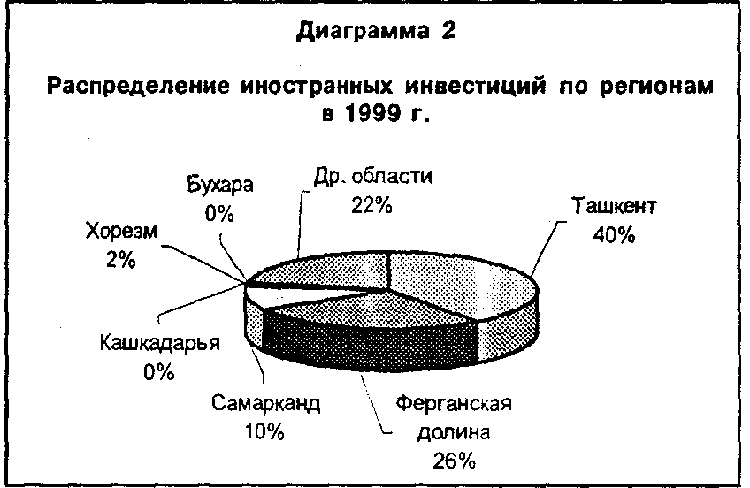 В Что касается территориального распределения, то по объемам привлеченных иностранных инвестиций выделяются Ташкентский (40%) и ферганский (26%) регионы (диаграмма 2).