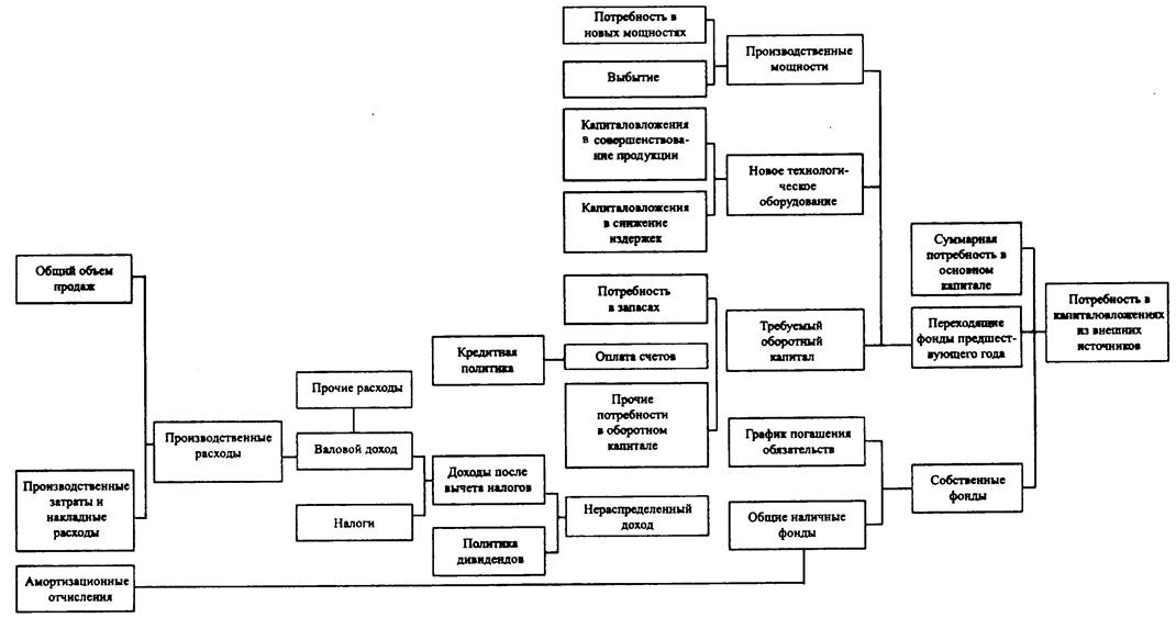 Рисунок 5.1. Структура капиталовложений предприятия. ных средств, планируемые ставки рефинансирования и кредитования проектов и многие другие факторы неопределенности, как внутренней среды, так и внешнего окружения предприятия. В рыночных отношениях промышленных предприятий, банковских структур и финансовых организаций основными источниками инвестиций являются собственные доходы фирм и организаций, привлеченные капиталы акционеров и учредителей, целевое финансирование из федеральных или региональных фондов, кредиты коммерческих банков, выпуск ценных бумаг или эмиссия акций корпораций, спонсорские и другие виды взносов и т.п. В каждом из перечисленных источников финансирования капиталовложений существует много общих правил и особенностей максимизации результатов и минимизации затрат. В современной зарубежной экономической теории и хозяйственной практике нет разногласий относительно роли стоимости капитала, однако нет согласия относительно этого понятия, а, следовательно, и его измерения. В мире современных рынков и финансово-экономической стабильности такой проблемы не существует. Результаты эффективной финансовой деятельности многих зарубежных фирм и корпораций давно уже доказали, что в условиях определенности ставка процента играет роль стоимости капитала и представляет собой рыночную ставку обмена между сегодняшними и будущими деньгами. Поскольку риск в этом случае отсутствует, то здесь нет разницы между стоимостью долга и акции. Доходность любого инвестиционного проекта зависит от условий рынка капитала, определяющих ставку процента, которая регулирует спрос и предложение средств. Приемлемость проекта зависит главным образом от величины рыночной ставки процента. Иными словами, он может быть принят при одних ставках и не рекомендован при других. Следовательно, ставка процента, впрочем, как и любая другая рыночная цена, выполняет свою распределяющую роль. Она также выполняет эту функцию и в условиях неопределенности, когда одна ставка процента заменяется рядом других, каждая из которых связана с различной степенью неопределенности в планировании затрат и результатов. Таким образом, действующая в условиях рынка учетная ставка процента или норма прибыли на капитал служит не только основой долгосрочного планирования требуемых инвестиций, но и распределения имеющихся денежных ресурсов. В первые годы перехода от плановой экономики к рыночной учетная ставка рефинансирования Центрального банка Российской Федерации выросла в сотни раз, что лишило большинство предприятий возможности брать кредиты на долгосрочное развитие. Максимальная ставка Центрального банка Российской Федерации в размере 210% пришлась на период с 15 октября 1993 г. по 29 апреля 1994 г., и затем пошло ее медленное снижение. Коммерческие банки выдавали в этот период кредиты предприятиям под 300 и более процентов годовых. В первом полугодии 1998 г. минимальная ставка составляла 30%, средняя — 50%, максимальная — 150%. По прогнозам, ставка непрерывно будет снижаться после 2000 г. до 6%-10%, как в цивилизованных рыночных странах. В США, например, она составляет 5,75% годовых. Снижение учетной ставки будет способствовать широкому использованию банковских кредитов для подъема производства на отечественных предприятиях. Кредитование всех предприятий и