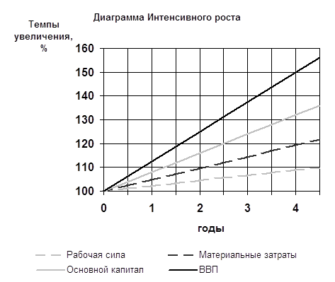 Позже американский экономист Р.Солоу установил, что с 1909 г. по 1949 г. в США более чем 80 % роста ВВП объясняется техническим прогрессом, т.е. интенсивными факторами, а не затратами труда и капитала. Второй тип экономического роста называется интенсивным. Он имеет место, когда рост ВВП опережает рост количества занятых экономических ресурсов γt>Nt Интенсивный экономический рост – это более сложный тип, поскольку решающую роль в нем начинает играть научно-технический прогресс. Следовательно, он предполагает высокий уровень развития производительных сил, техники, технологии, высокий образовательный и профессиональный уровень работников. Этот тип экономического роста дает возможность преодолеть проблему ограниченности ресурсов. То есть одним из наиболее важных источников экономического роста при этом типе становится ресурсосбережение, которое обходится обществу значительно дешевле, чем рост ресурсов. Графически это можно выразить в виде диаграммы.