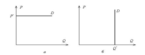 Рис. 1. Относительно эластичный (а) и относительно неэластичный (б) спрос Существует два крайних случая. Первый случай — существование только одной цены, при которой товар будет приобретаться покупателями. Любое изменение цены приведет либо к полному отказу от приобретения данного товара (если цена повысится), либо к неограниченному увеличению спроса (если цена снизится). При этом спрос является абсолютно эластичным, показатель эластичности бесконечен. Графически этот случай можно изобразить в виде прямой, параллельной горизонтальной оси (рис. 2, а). Например, спрос на помидоры, продаваемые отдельным торговцем на городском рынке, абсолютно эластичен. Однако рыночный спрос на помидоры не является эластичным.