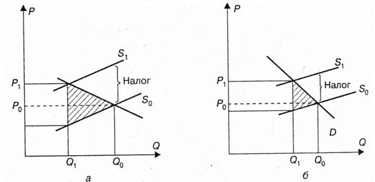 Рис. 6. Распределение налогового бремени при эластичном (а) и неэластичном (б) спросе: D — спрос; S0, S1, — предложение до и после введения налога [Л1, с. 199]. Что произошло, когда государство ввело налог? Кривые предложения переместились влево вверх на величину налога. Возникла новая ситуация равновесия Q1 и Р1. Таким образом, цена товара будет повышена производителем. Но насколько? Производитель в условиях рыночной экономики может увеличить цену на сумму налога (хотя в России в переходной экономике это часто наблюдалось), установить ее выше равновесной, так как в условиях конкуренции он будет вытеснен с рынка. Единственное, что он может сделать — это поднять цену до равновесного уровня. В случае если спрос эластичен, потери производителя будут выше, бремя налога ляжет в основном на него. На рис. 6, а выделенный прямоугольник показывает величину налога, его часть ниже пунктирной линии — потери производителя от налога. Кроме того, производитель будет вынужден сократить производство до Q1, потеряв часть покупателей своей продукции за счет более высокой цены на нее. В случае если спрос неэластичен, налоговое бремя ляжет преимущественно на потребителя. Кроме того, абсолютный размер налога также будет выше при неэластичном спросе. Именно поэтому государство облагает акцизными и другими косвенными налогами товары, спрос на которые неэластичен (сигареты, алкогольные напитки и т.п.). Следует обратить внимание на заштрихованные треугольники на рис. 6. Они очерчивают продукцию, которая была бы произведена и куплена, если бы государство не ввело налог. Это те потребители, которые хотят, но не могут купить товар, и те производители, которые хотят, но не могут произвести его. Несовпадение желаний и возможностей является прямым следствием установленного налога и представляет собой потерю для общества. Причем эта потеря будет тем выше, чем выше эластичность спроса на данный товар. Теперь рассмотрим зависимость распределения налогового бремени от эластичности предложения (эластичность спроса примем постоянной). Рис. 7 иллюстрирует ситуацию до и после введения налога.